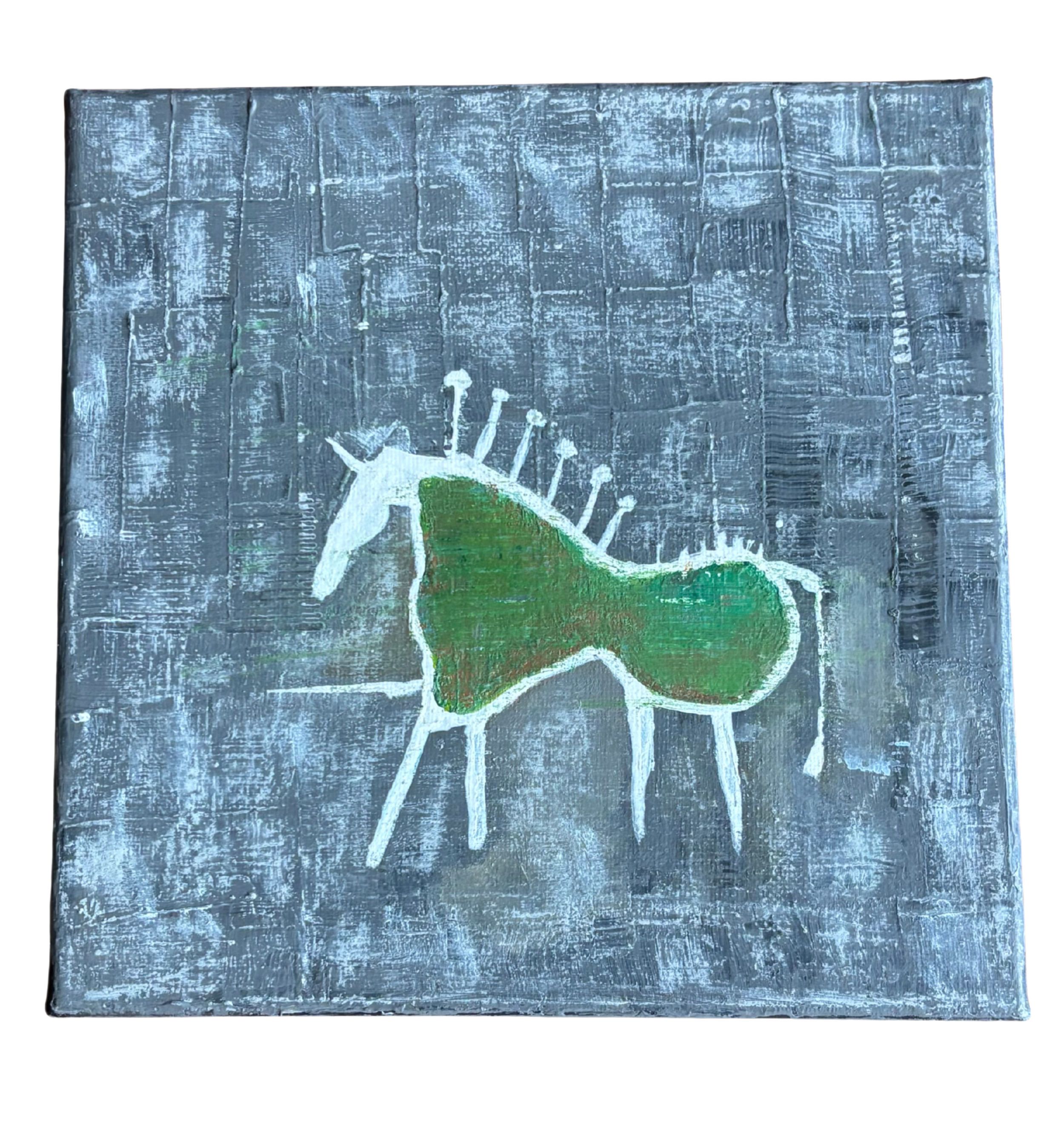 This painting places the horse - a figure of strength and instinct - within a cement-grey expanse, dense and architectural, evoking industry and modern construction. Rendered in a corroded green patina, the body recalls weathered bronze, as though time has settled into its surface, turning motion into monument.