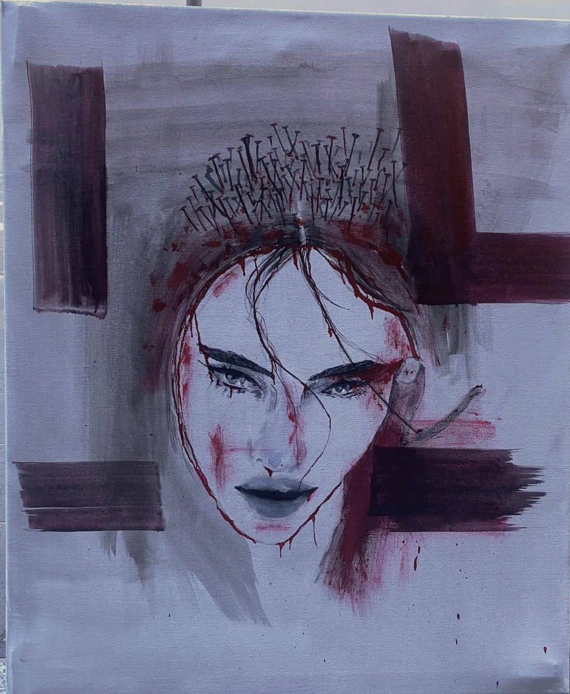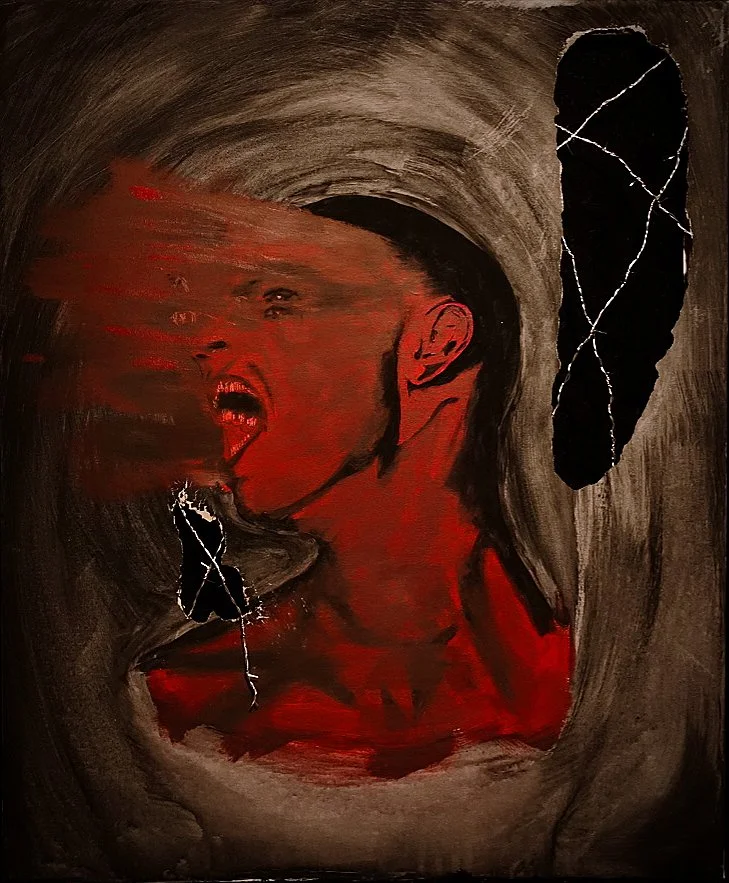 Wired and Hustle Culture resist comfort and easy categorisation. In Wired, a screaming figure is pierced by barbed wire forced through burnt holes in the canvas, making the surface itself wounded. In Hustle Culture, nails driven into a woman’s skull symbolise pressure and overextension, while her act of wiping away blood reflects endurance without glorifying the pain.