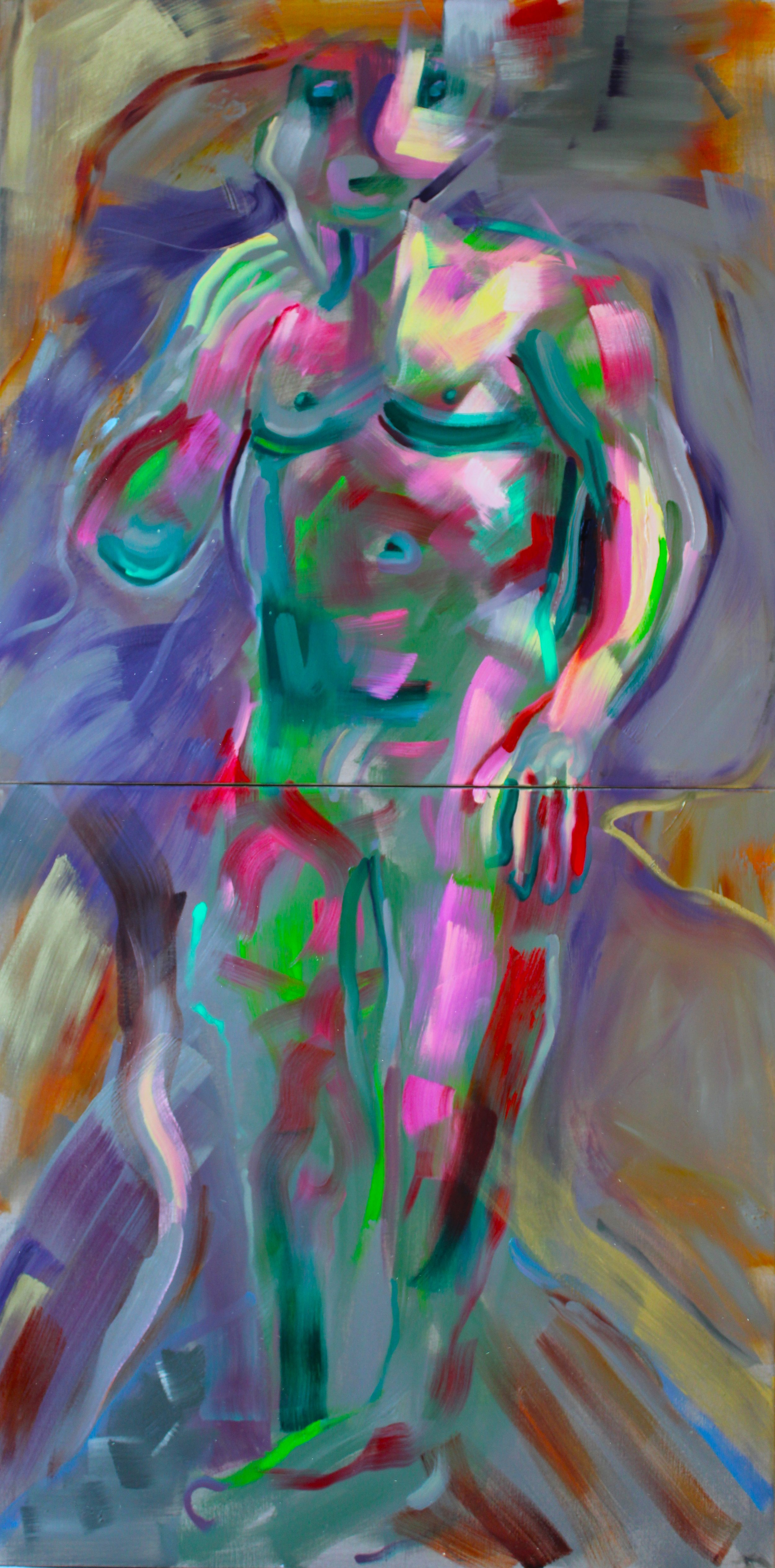 This body of work consists of paintings that explore the oscillation between figurative and abstract modes of visual representation. These paintings are derived from figure drawings done from life. I have used bright, colourful brushstrokes to push the human form into a more abstract depiction of space.